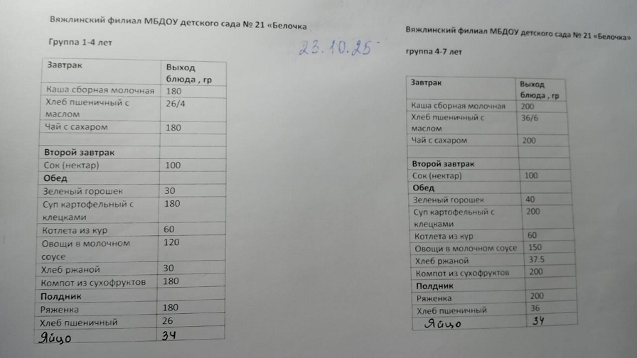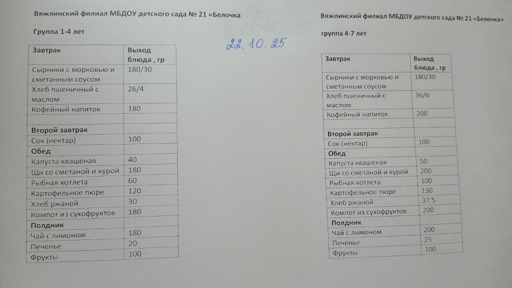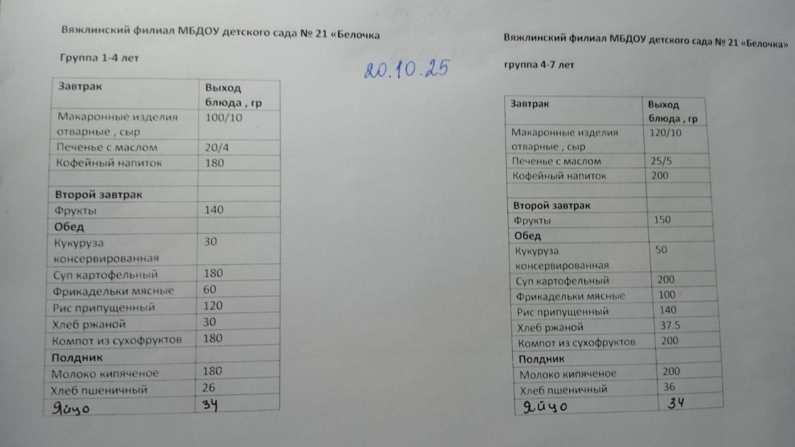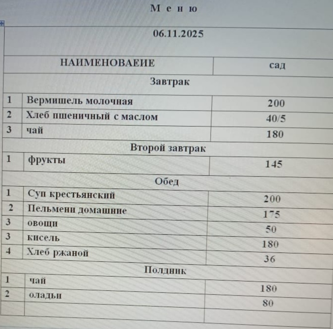 Основное 10-дневное меню для питания детей в возрасте от 3 до 7 лет